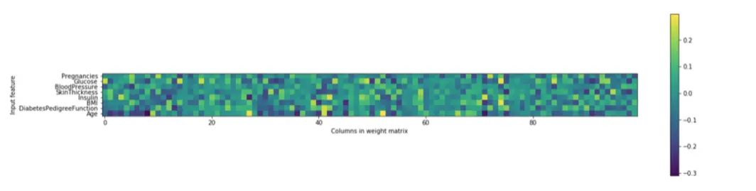 最后,我们绘制学习糖尿病数据集的神经网络的第一层权重的热图。