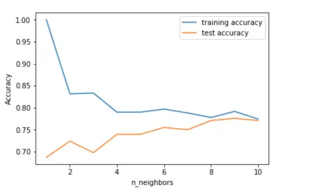 如上图所示,y 轴表示的训练和测试集精度和 x 轴表示的 n 近邻数呈反比。想象一下,如果我们只选择一个近邻,在训练集的预测是很完美的。但是当加入了更多的近邻的时候,训练精度将会下降,这表示仅选用一个近邻所得到的模型太过复杂。最佳实践是选择 9 个左右的近邻。