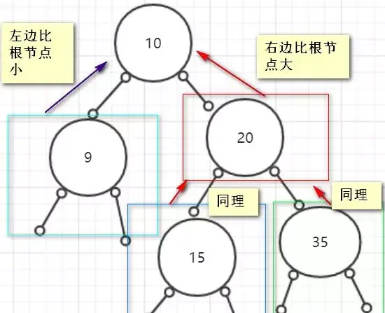 定义:当前根节点的左边全部比根节点小,当前根节点的右边全部比根节点大。