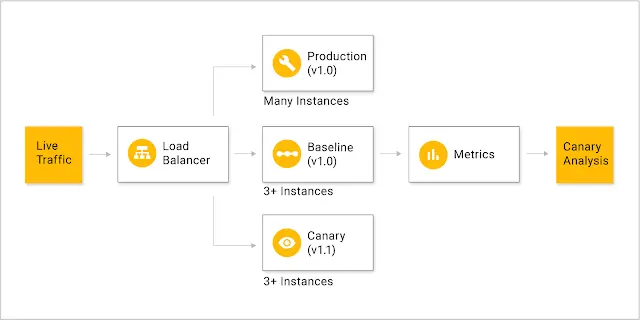 Canary分析是减少生产环境中更新对终端用户影响的风险的好方法。基本的思路是把很小的一部分生产环境流量,例如1%,同时导到含有最新更新的部署的服务器(这也就是所谓的canary)以及与目前生产环境代码和配置一样的服务器(基准参考)上去。生产环境本身没有任何更改。典型地配置是canary和基准配置分别分配三台服务器,生产环境分配多台服务器。建立基准参考服务器是为了减少启动效应从而降低基准服务器和canary服务器间的系统误差。之后系统会比较canary服务器和基准服务器之间关键指标的差别。要继续部署的话需要canary服务器的性能不差于基准服务器的性能。