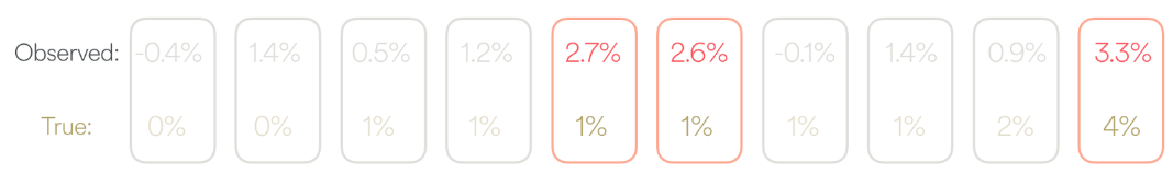 假设我们进行10次A/B测试,每一次测试的标准差都是1%。我们在每次测试中都有足够的样本参与,然后得到每次测试效果如下图中的第一行数据。同时,图中的第二行数据代表了真实效果,但我们暂时假装并不知道它们。