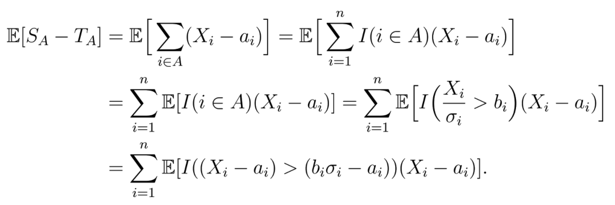 如果我们把入选方案用集合表示为 A= {i|Xᵢ /σᵢ > bᵢ},那么对这些方案的真实效果求和就得到:T_A = ∑{i ∈ A} aᵢ。而如果我们把每次测试的观测结果求和就得到:S_A= ∑{i ∈ A} Xᵢ .注意,因为A是个随机的数列,所以T_A也是随机的,且基本上ES_A ≠ ET_A。同时,将预期的真实效果值用公式表示就是:E[T_A] = E[∑{i ∈ A} aᵢ].
