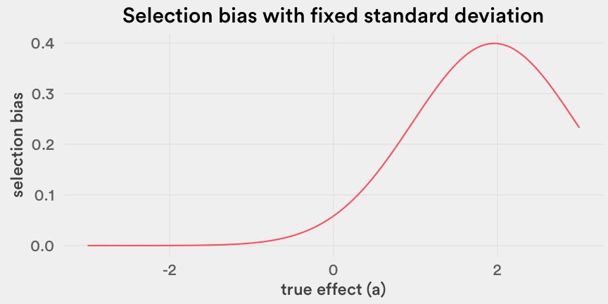 考虑到在均值为0的分布中低截断部分的均值总是一个正值,则这些均值的所有加和项也是正值,进而可以判断“选择偏差”也基本是一个正值。看看在下面的图中,我们将以上求和公式构画成出来就获得了真实效果 aᵢ在正态分布情况下的函数(当然,别忘了我们的假设σᵢ =1,bᵢ是t检验中两个标准偏差的阈限值,即1.96 )。