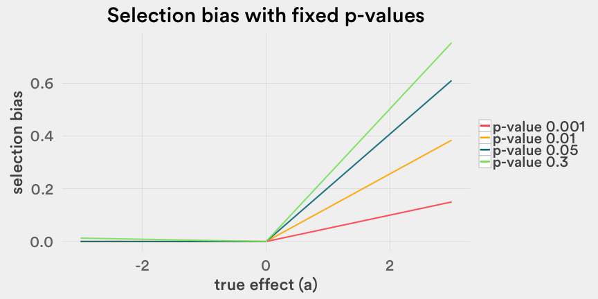然后,我们还能构画一个描述效果和p值的图表来描述选择偏差。如下图,可以看到偏差量也随着真实效果的增加呈现出线性增长的趋势。