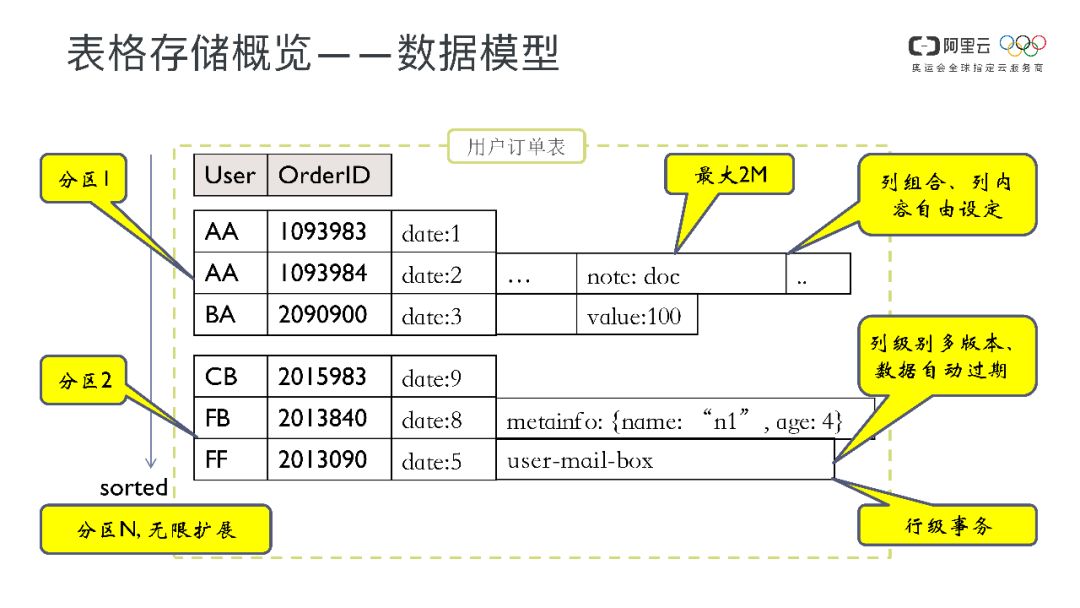 数据模型这是表格存储的数据模型,只关注一点就可以了,就是分区机制,后面的内容会依赖这个。