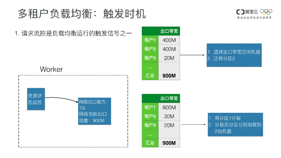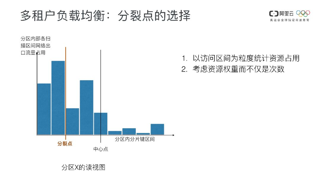 而右下的这个表,是一个租户占用了特别多的资源,此时无论移动到哪台机器上都无法解决问题,所以就需要将其分裂,分成2个分区后使得每个子分区占用的出口带宽尽可能的平均,然后就可以分别调度到两台机器了。