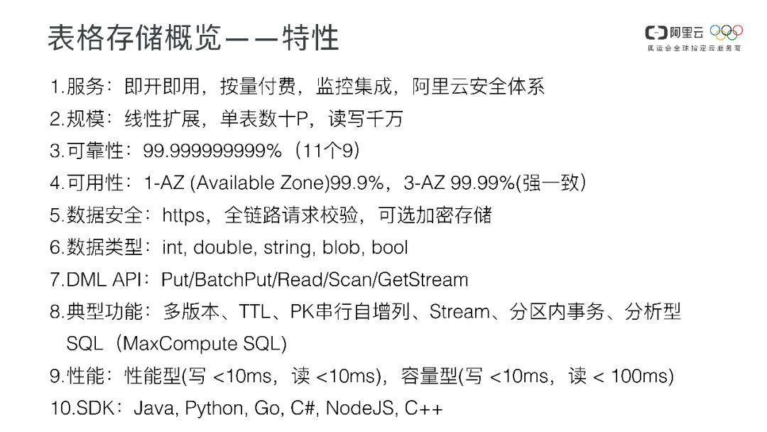 Table Store是构建在阿里云飞天系统之上的分布式NoSQL数据存储服务,支持单表千万级读写和数十P数据存储,具备99.99%的数据可用性以及11个9的数据可靠性。表格存储基于庞大的共享资源池来服务客户,通过负载均衡来协调不同客户对资源的诉求,削峰填谷带来了成本的下降,并最终让客户收益。