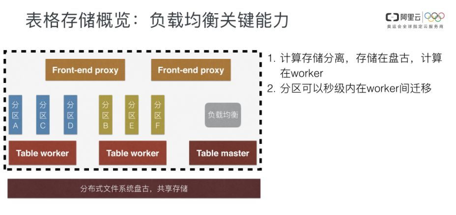 表格存储负载均衡依赖一些关键能力。首先表格存储使用分布式文件系统作为共享存储,这使得任何一个worker都可以随时访问任意数据,这也就带来了第二点提到的优势,即想将某个分区从一个worker迁移到另外的worker要比传统分库分表容易很多,只要调度上做一个简单的调整就可以,不需要搬动数据,可以非常快的完成。