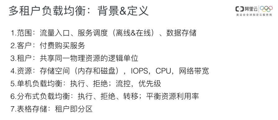这里我们将租户定义为共享资源的逻辑单位,每个这样的逻辑单位都会消耗CPU、内存、网络带宽、磁盘IOPS。这个逻辑单位,也就是租户,跟表格存储里面的分区对应,后文中根据上下文不同租户和分区都会使用,概念上等同。