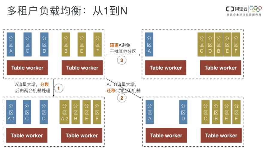 随着业务的上线,可能发生如下3种情况。第一是客户业务突然上涨,此时该客户的数据表可能只有一个分区(刚开始建表默认只有一个分区),该分区即使将某台机器资源全部吃掉也无法服务这么多请求,系统识别这种情况后会迅速将该分区分裂开来,变成两个分区,并再挑选一台机器,让他们共同服务该客户请求。