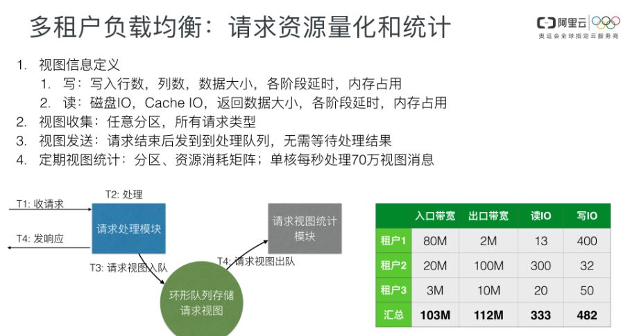 每个请求执行过程中都会尽可能的收集这些视图信息,在请求执行结束的时候,视图交给视图统计模块的环形队列,然后就直接发送响应。视图统计模块会异步的统计各个租户对各个资源的占用,每隔一个周期,视图统计模块就会输出一个类似右下角的表格,里面包含每个分区对每种资源的使用情况。