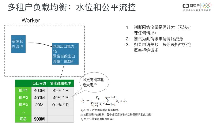 从例子可以看出,400M大户被拒绝的概率是49%,注意这里还有一个R,这个意思就是资源繁忙的程度,比如网络流量超过80%认为繁忙,当前如果流量占用达到90%,则(90%-80%)/90%=11%,从网络出口角度看,11%的请求应该被拒绝掉,由此可以算出租户1的请求中49%*11%=5.4%的请求应该被拒绝掉。
