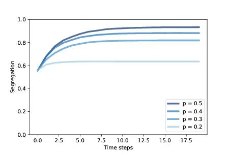 图?显示了隔离程度如何增加,以及它在几个p值下的平稳位置。 当p = 0.4时,稳定状态下的隔离程度约为 88%,且大多数智能体没有不同颜色的邻居。