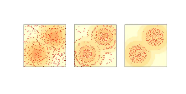 图 9.5:Sugarscape中的波动行为:初始状态(左),6 步后(中)和 12 步后(右)