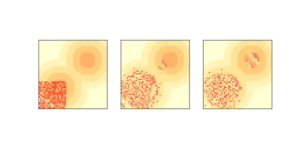 图?(中)显示两步后模型的状态。 大多数智能体正在移到糖最多的地区。 视力高的智能体移动速度最快;视力低的智能体往往会卡在高原上,随机游走,直到它们足够接近来看到下一个水平。