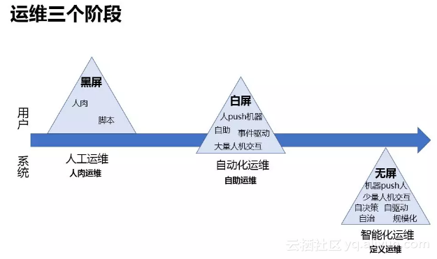第一阶段:黑屏,三角形是代表整个运维给用户的一些体感或者给研发的体感,人工运维,目前很多企业可能还是这样。