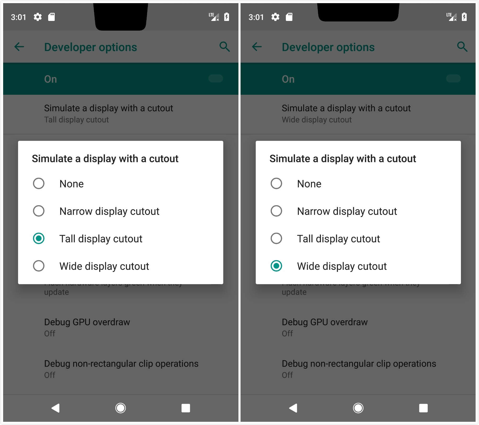 如果你把所有的模式都试过一遍,你会发现,其实刘海屏的刘海,在 Android P 上,是有多种样式的,并非统一的。