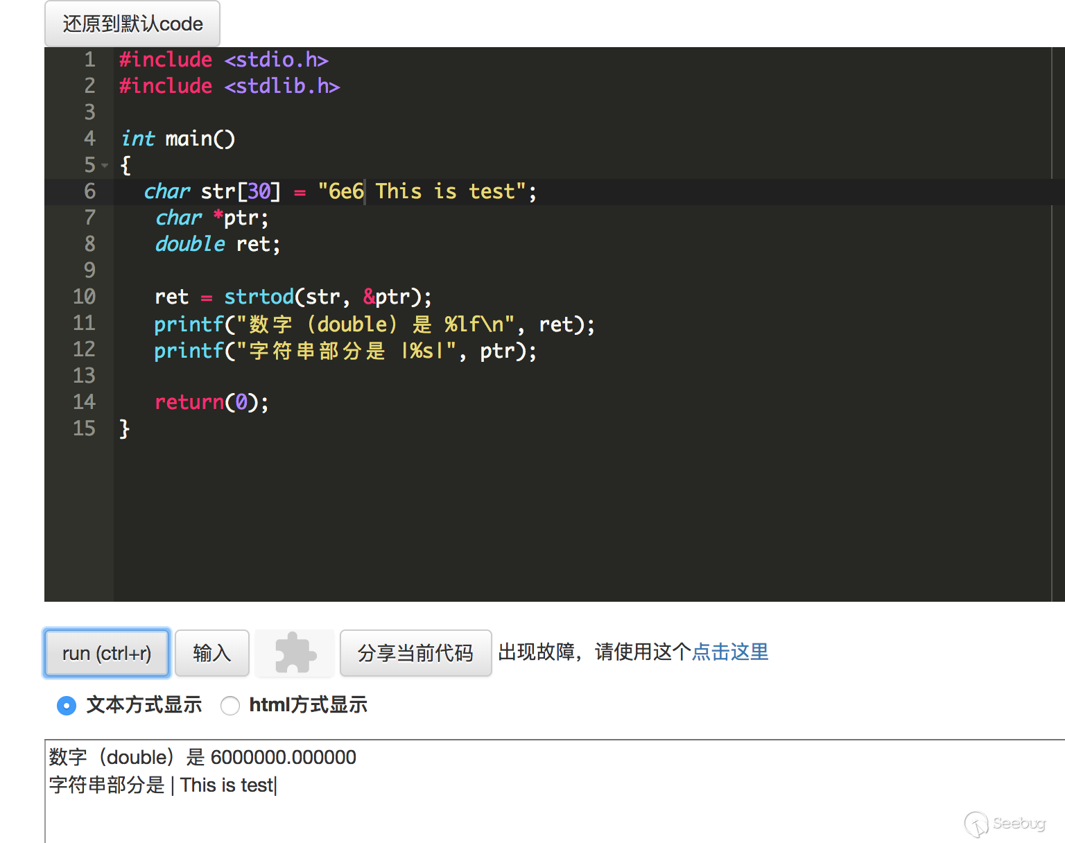 可以看到当接收到科学计数法表示的字符串跟一个整型变量运算(‘6e6’-0),6e6自动并不是自动转换成了int型,而是转换成了float,所以最终的数字是float型的6000000。最后两行代码可以直接的说明了问题。使用int强制转换一个科学计数法表示的字符串,转换过程中并不能识别科学计数法,只是把e当做普通字符了。效果跟6a6是一样的。而用float转成浮点数,则可以成功识别科学计数法。