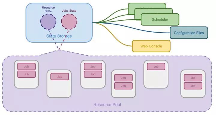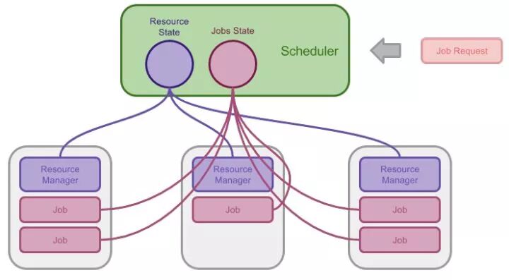 为了解决这些问题,一种新的调度器架构被设计出来。这种架构基本上沿袭了集中式调度器的模式,通过将中央调度器肢解为多个服务以提供更好的伸缩性。这种调度器的核心是共享的集群状态,因此可以被称为共享状态调度器。
