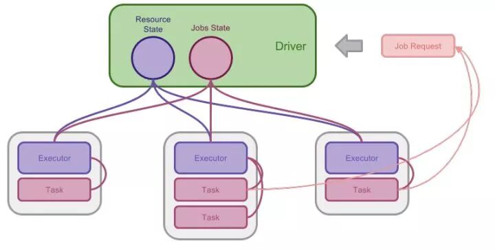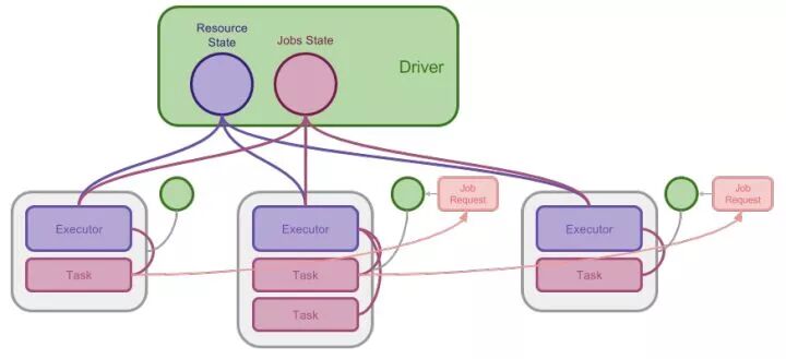 Spark 为了调度和执行自己基于 DAG 模型的计算,自己实现了一个集中式的调度器,这个调度器的 Master 被称为 Driver。当 Driver 运行起来的之后,会向上层的 Scheduler 申请资源调度起 Executor 进程。Executor 将会一直保持待机,等候 Driver 分配任务并执行,直到任务结束为止。