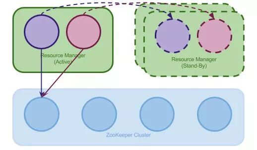 Active 的 ResourceManager 会定期保存自己的状态到 ZooKeeper,当其失败退出后,一个 Stand-By Master 会被选举出来成为新的 Manager。