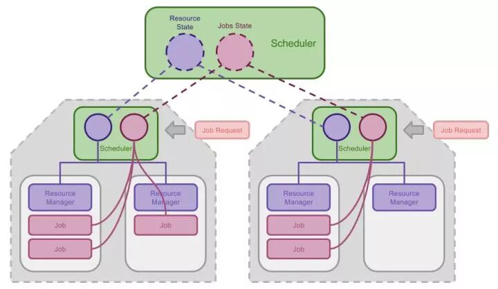 在双层调度器当中,资源的使用状态同时由分区调度器和中央调度器管理,但是中央调度器一般只负责宏观的、大规模的资源分配,业务压力较小。