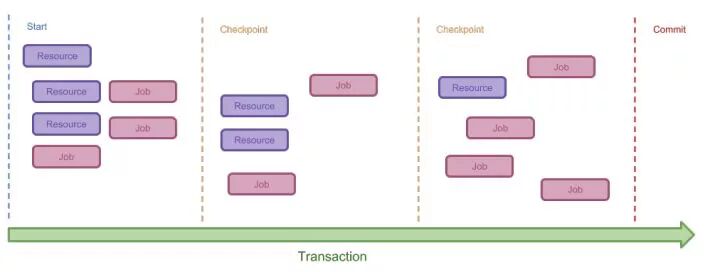 Transaction设计保留了一般事务的诸多特性:如嵌套Transaction或者 Checkpoint。当资源无法获取或任务执行失败,事务将会被回滚到上一个 Checkpoint 那里;