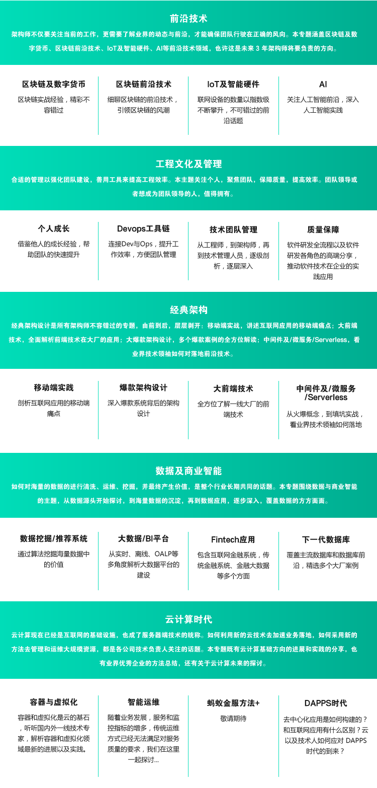本次大会共有 5 大板块方向,20 场技术专题,70 个互联网架构案例。