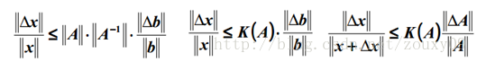 也就是我们的解x的相对变化和A或者b的相对变化是有像上面那样的关系的,其中k(A)的值就相当于倍率,看到了吗?相当于x变化的界。