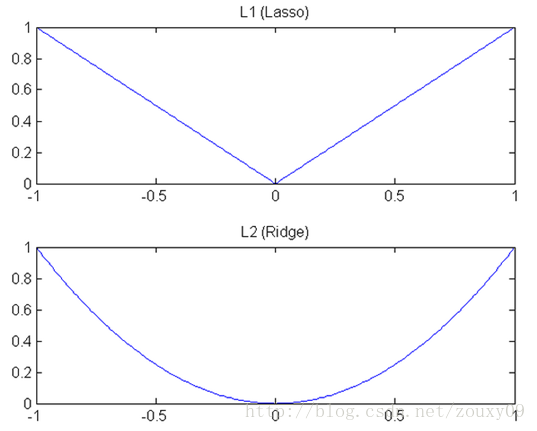 我们知道,L1和L2都是规则化的方式,我们将权值参数以L1或者L2的方式放到代价函数里面去。然后模型就会尝试去最小化这些权值参数。而这个最小化就像一个下坡的过程,L1和L2的差别就在于这个“坡”不同,如下图:L1就是按绝对值函数的“坡”下降的,而L2是按二次函数的“坡”下降。所以实际上在0附近,L1的下降速度比L2的下降速度要快。所以会非常快得降到0。不过我觉得这里解释的不太中肯,当然了也不知道是不是自己理解的问题。