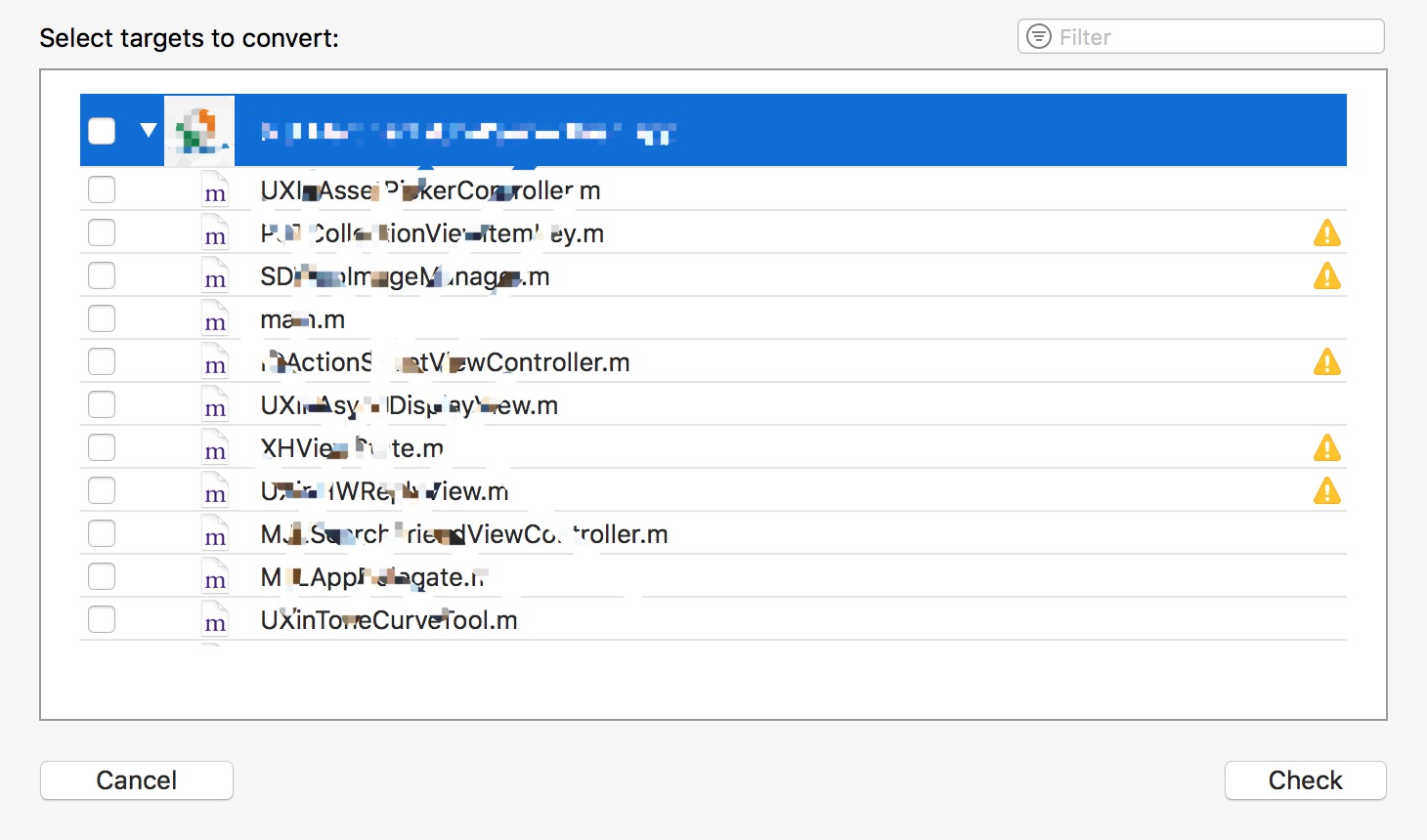 - 找出项目中引用的仍然使用手动内存管理的第三方库,或者哪些你不希望转换的文件,对其添加