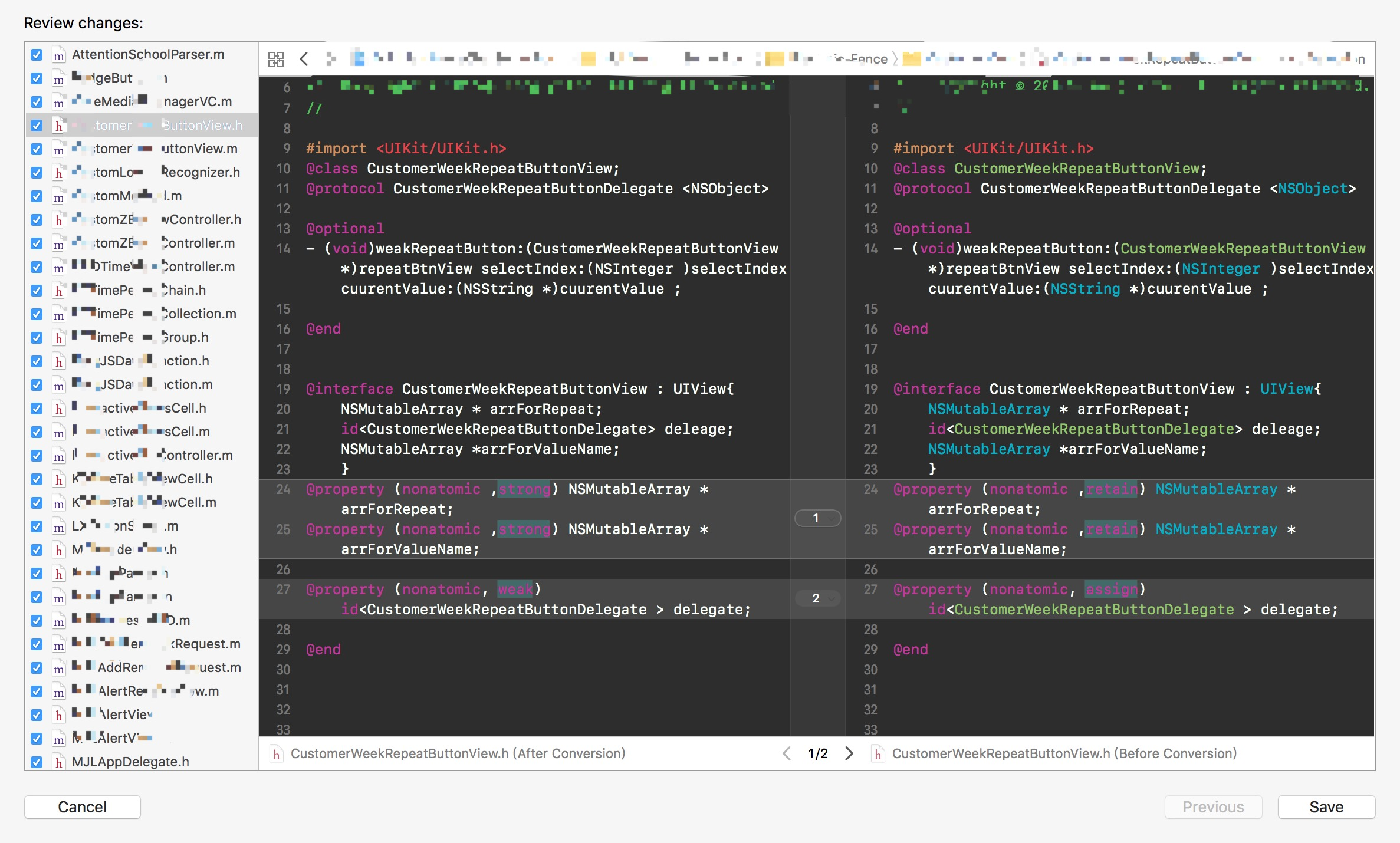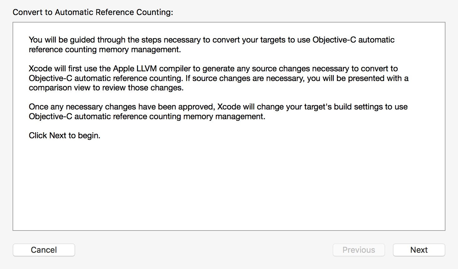 Xcode转换工具入口Edit->Convert->To Objective-C ARC,点击之后进入检查操作入口