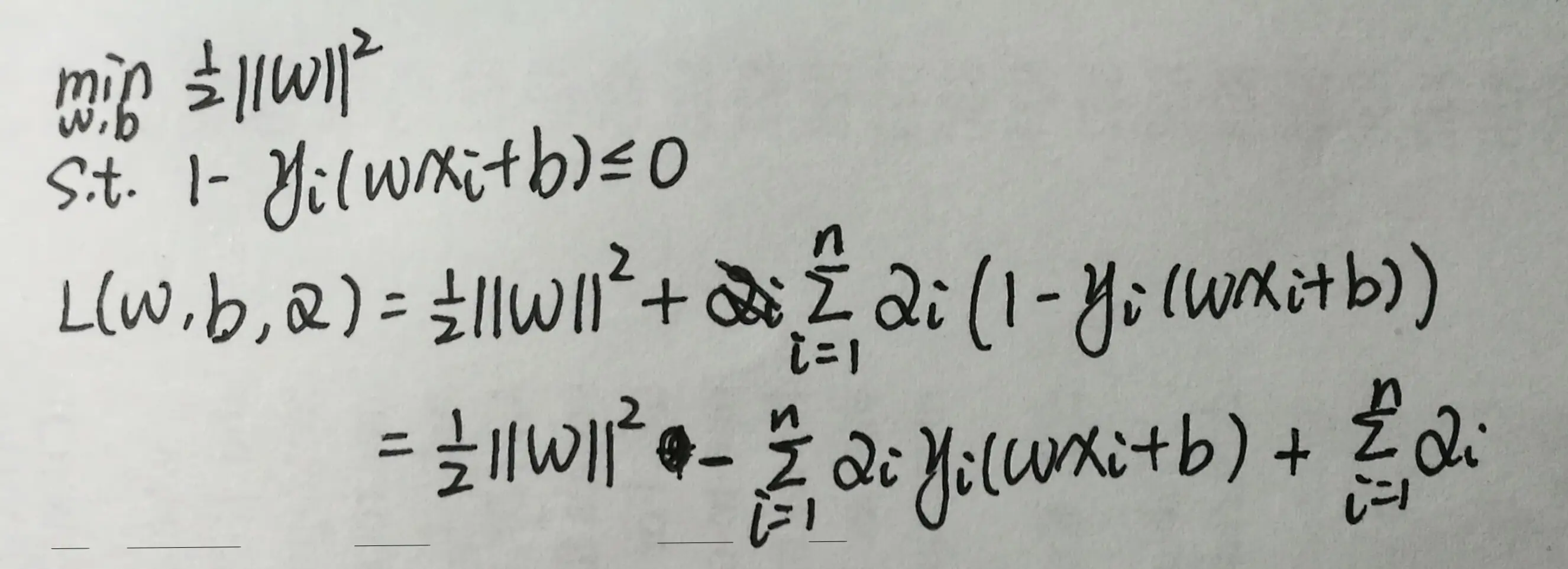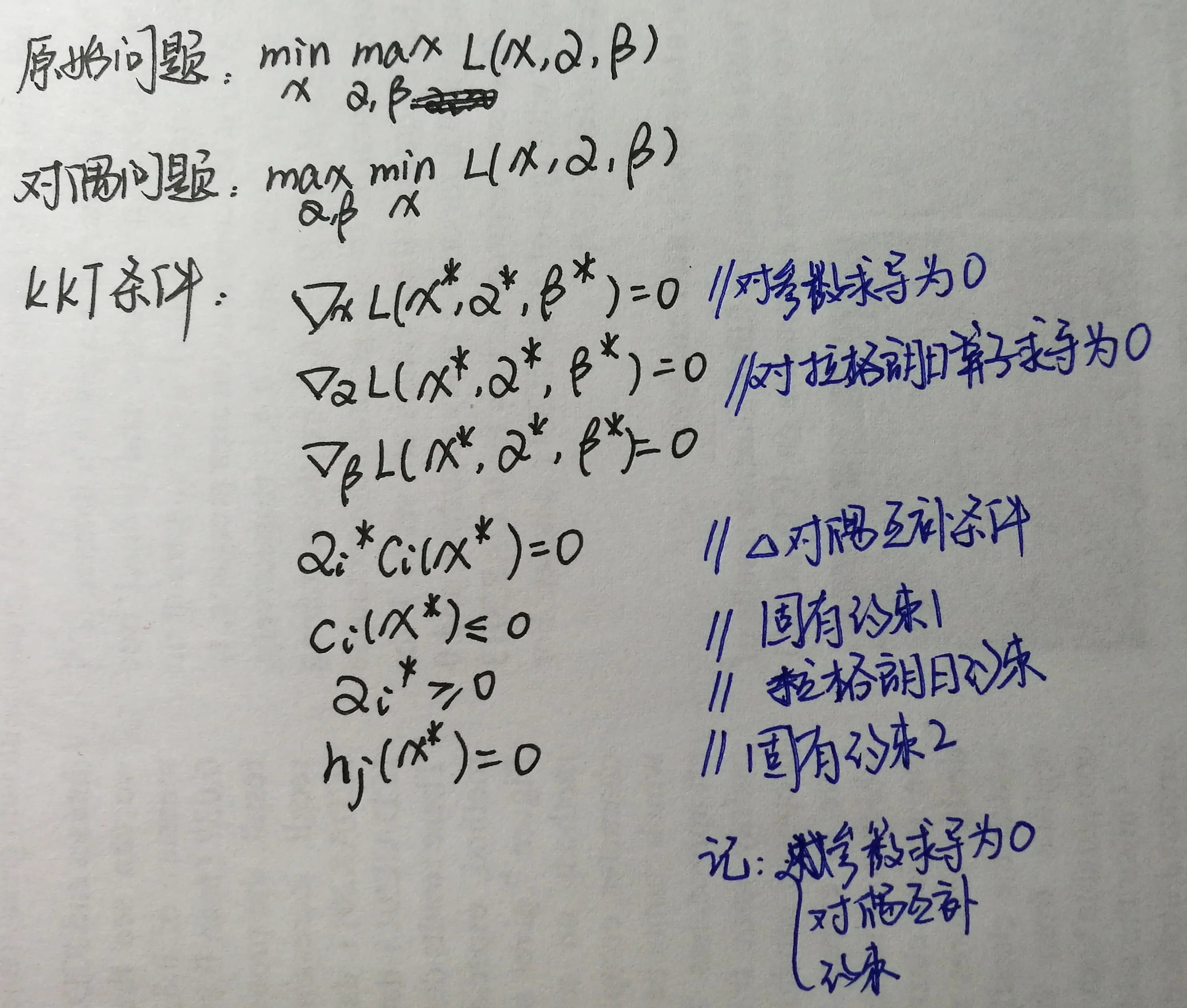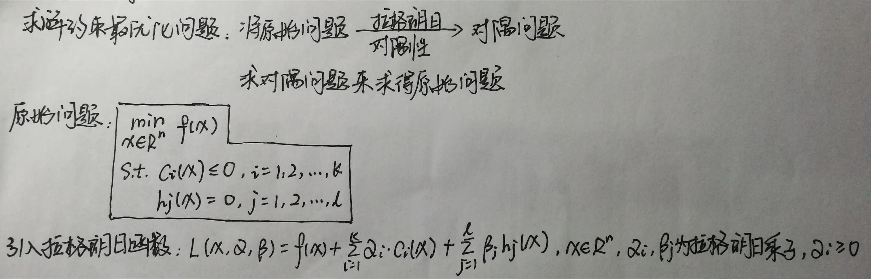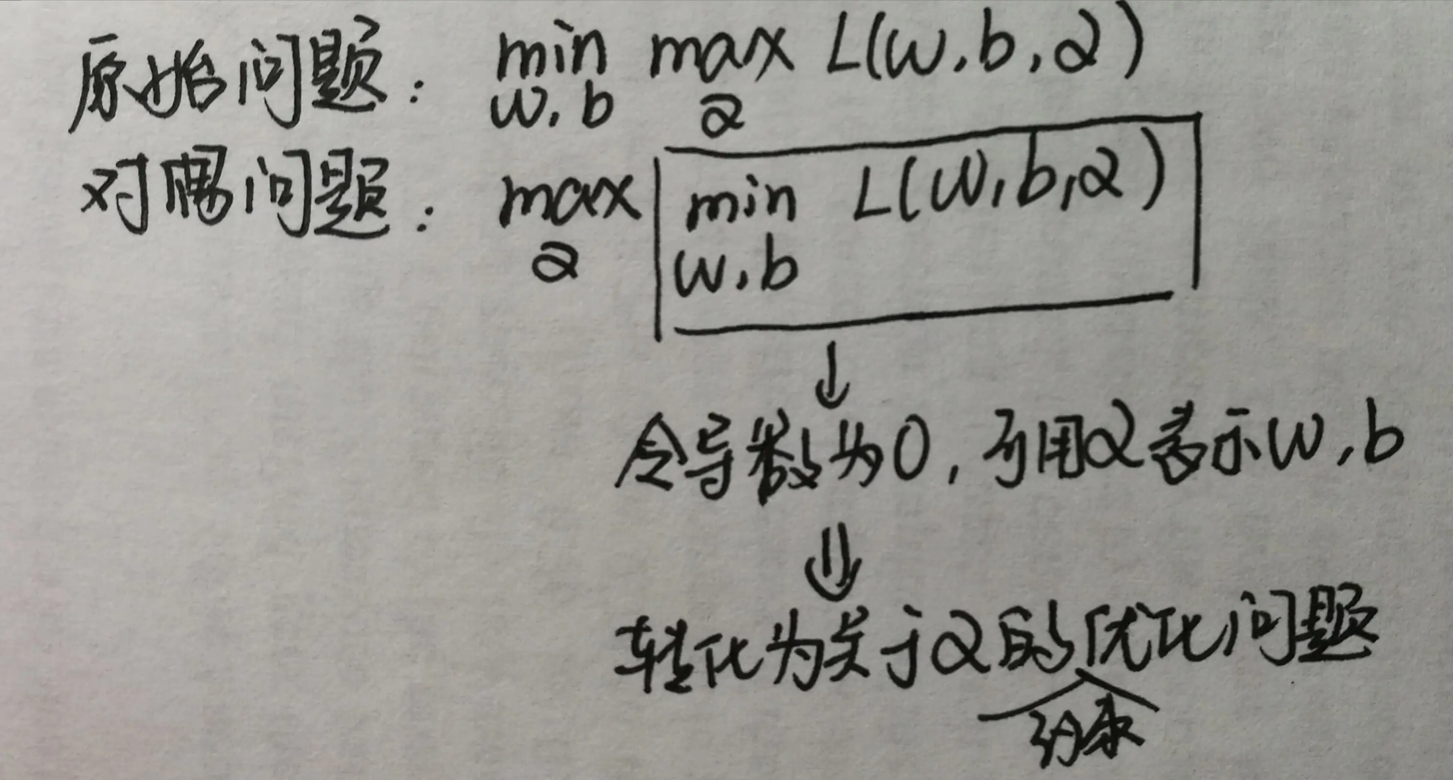 原始问题是极小极大问题,将其转换为对偶问题求解,并且只有当问题满足KKT条件时,可将对偶问题的解作为原始问题的解。