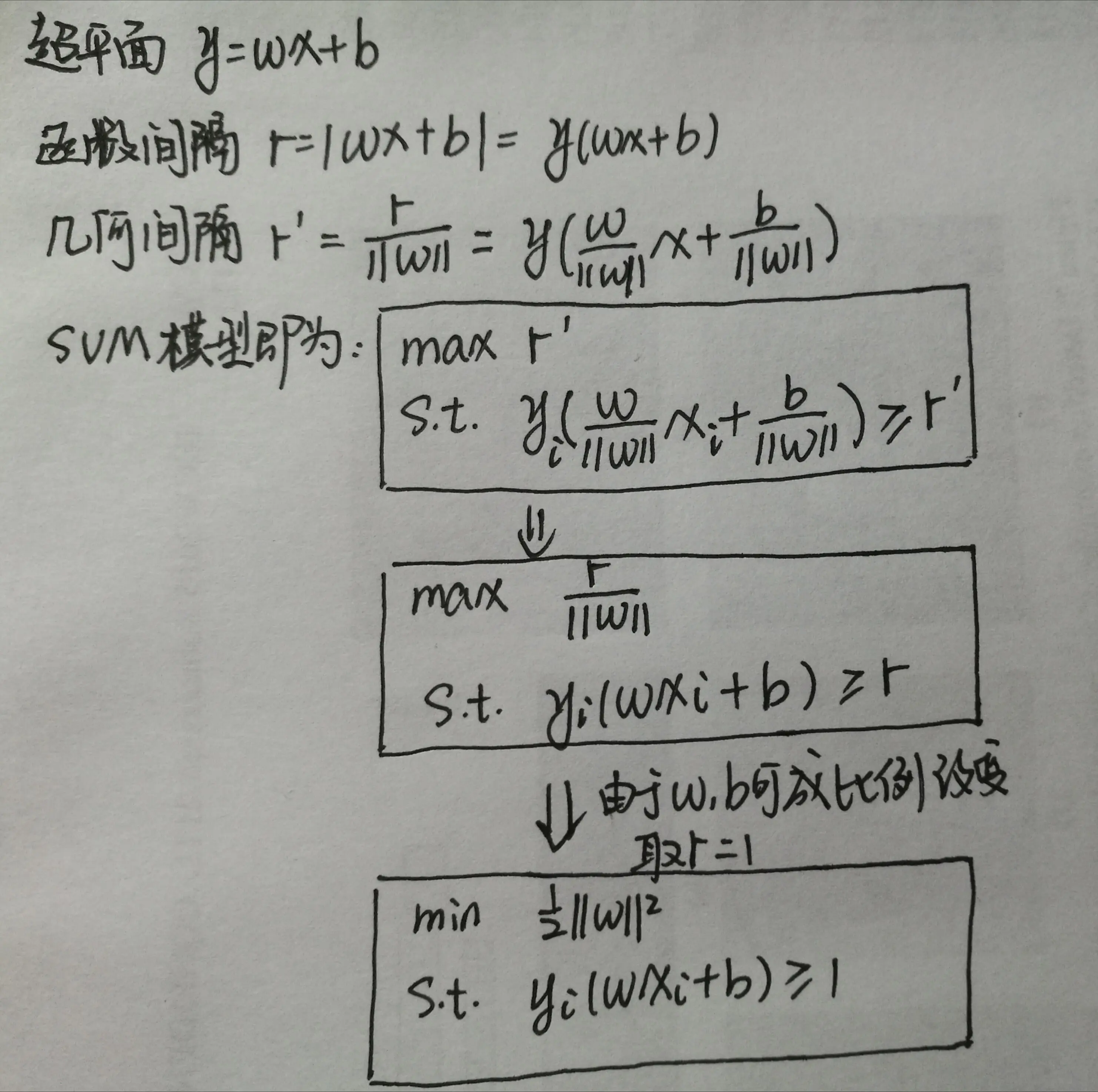 SVM是一个分类算法,通过寻找一个分离超平面,将正负样本分开,并且正负样本到超平面的间隔最大。分离超平面可以用y = wx + b来描述,样本到超平面的相对距离可以用函数间隔r = | wx + b |描述。当y+ = 1, y - = -1时,r = | wx + b | = y( wx + b )。但由于当w,b成比例变化时,超平面不变,但样本到超平面的距离会发生改变,因此改用几何间隔r' = y( wx + b)/ ||w||。整个模型可表示如下图: