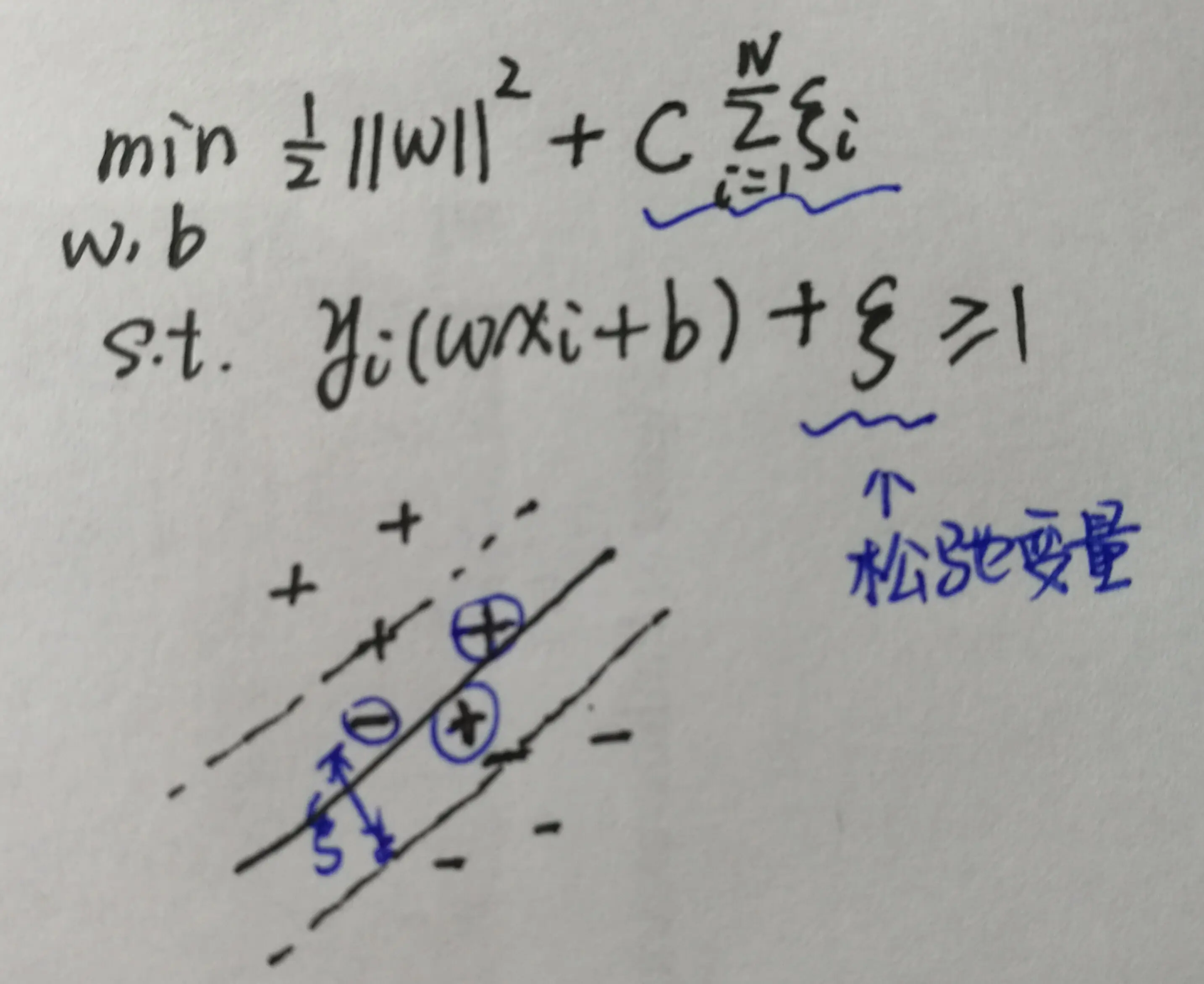 当样本无法被超平面完全分开时,引入松弛变量,使得不可分的部分样本能被超平面分开。但当松弛变量过大时,SVM分类模型就失去意义了,因此对松弛变量进行惩罚。