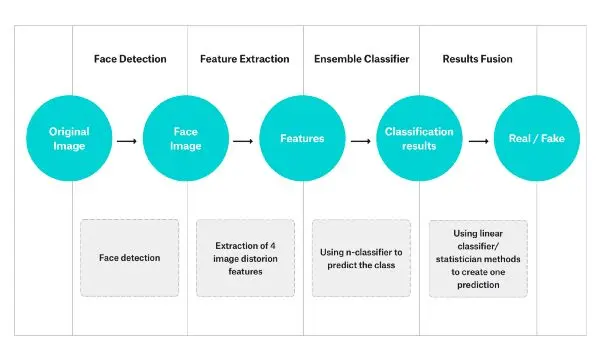 该解决方案基于将原始图像与用高斯滤波处理的图像进行比较。该论文的作者[1]证明了假图像之间的差异与真实图像之间的差异,并且可以自动检测。为了做到这一点,我们提取了14种流行的图像质量特征,例如:均方误差,平均差或边缘/角差。下一步是将它们发送给分类器,以确定它是“真实”的脸还是“假的”脸。