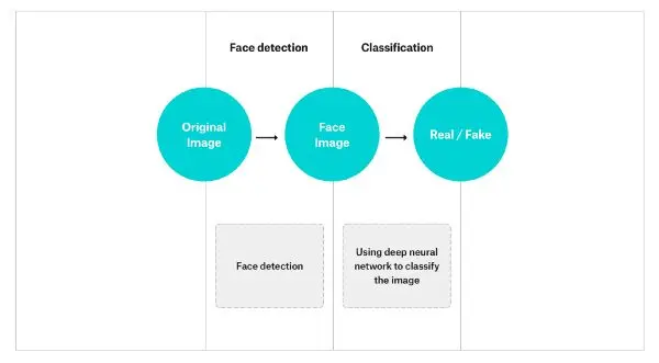 这是基于用CNN(卷积神经网络,这是图像分析中最流行的神经网络)建立的模型。裁剪后的人脸图像被传递到神经网络,然后通过神经层进行处理,以将其分类为真实/假的。