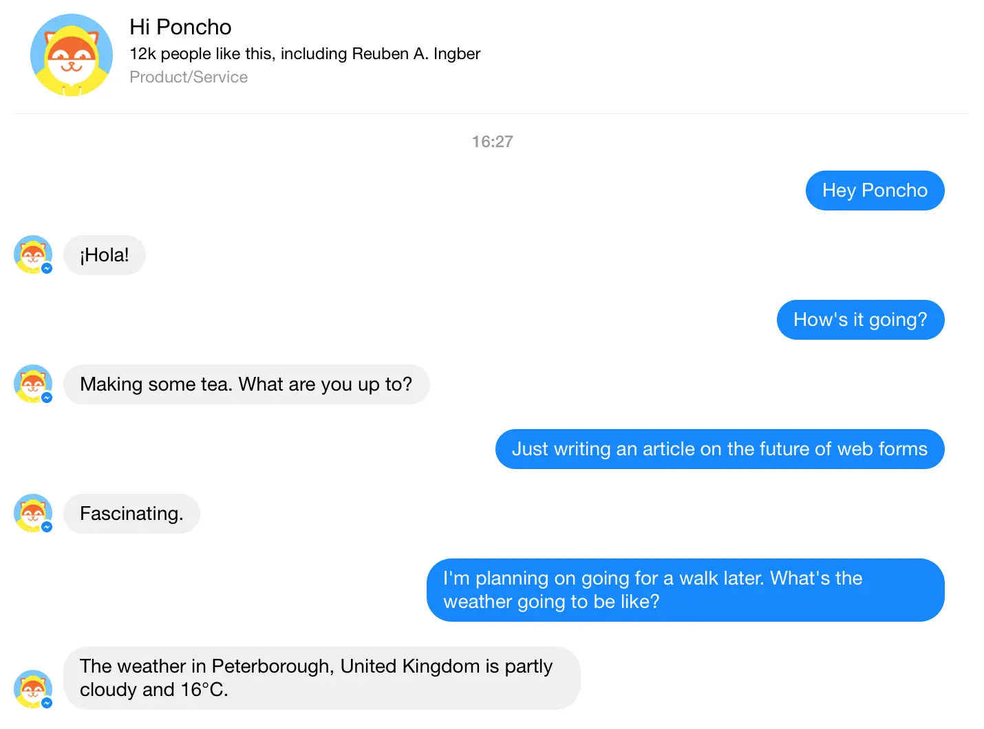 A conversation with Facebooks chat bot “Poncho”.