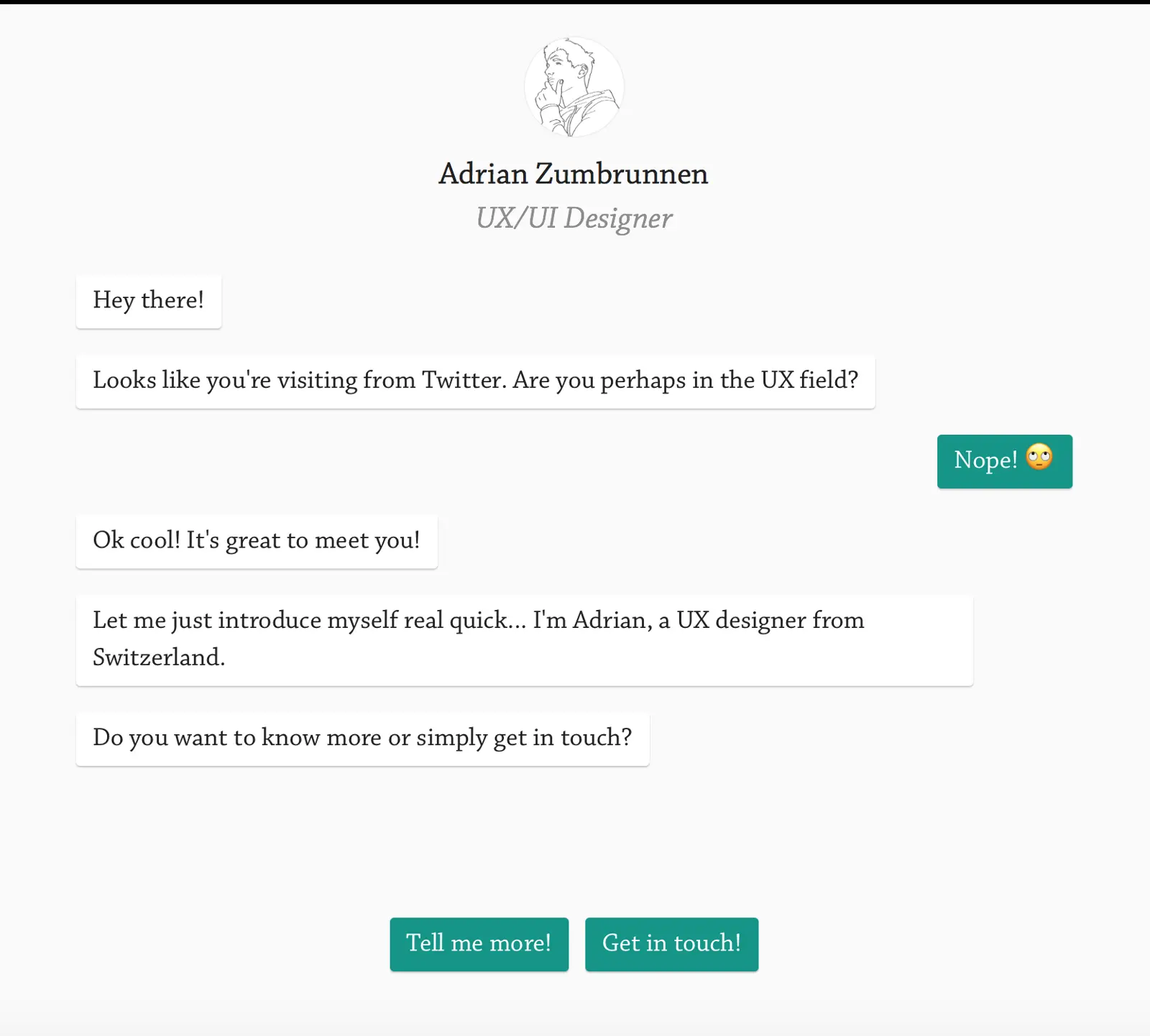 Adrian Zumbrunnen 在发布他的会话式的个人网站之后引起了互联网的关注。Adrian 设计了一个界面,通过一些回复选项来引导用户浏览他的 UI/UX 作品。Adrian 的网站巧妙的考虑到了用户如何到达他的网站并以此为信号来理解用户所处的情景。