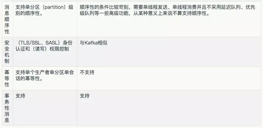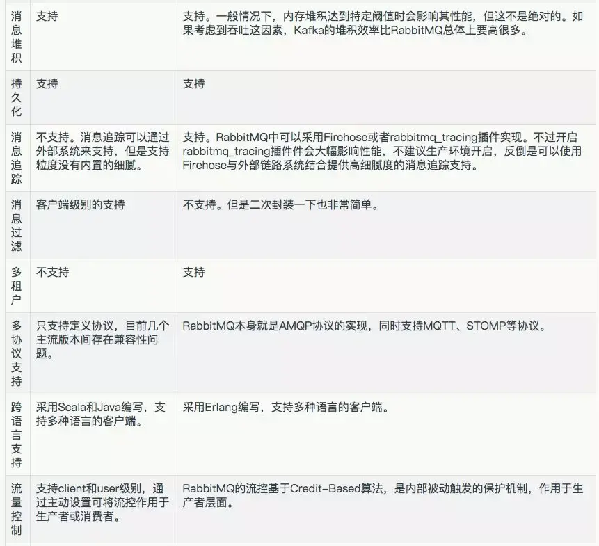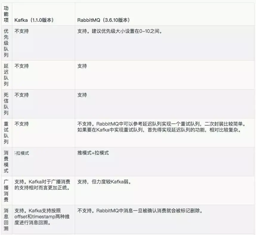 下表是对 Kafka 与 RabbitMQ 功能的总结性对比及补充说明。
