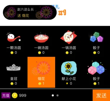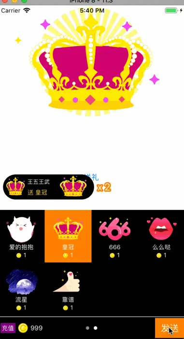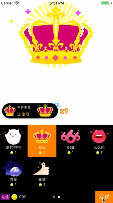 - 最简单的实现就是创建一个View在点击发送后把当前选中的礼物信息传入这个展示礼物效果的view中,写一个位移的动画进行展示.如果连送,那么就在view展示之前计算好一共连击多少次礼物,然后直接展示x几.如图