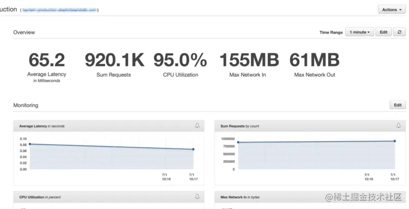 在我们的弹性负载均衡器完全热身之后的几分钟,我们看到我们的ElasticBeanstalk应用程序每分钟提供近100万次请求。我们通常在早上的几个小时里,我们的流量高达每分钟100多万。