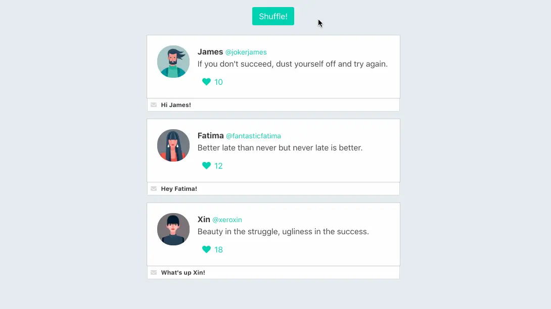 当调用shuffle时,tweet-component元素将在位置移动时有一个过渡的效果。试一试!在input中输入一些信息,然后多单击几次"Shuffle!"按钮几次。