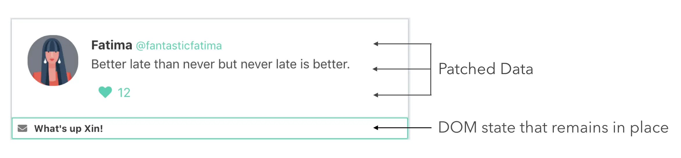 下图向我们展示了对每个元素和仍然存在的DOM状态进行数据的修补: