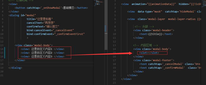 通过slot图所示,从图中可以知道通过slot插槽来接受modal-body里头自定义的代码。因为这里只需要一个插槽,所以插槽的名字可以省略,会自动配上。如果是需要多个slot的话,记得为插槽加上name="xxx"属性命名哦,对应的视图块通过 slot="xxx"接受对应的插槽数据。