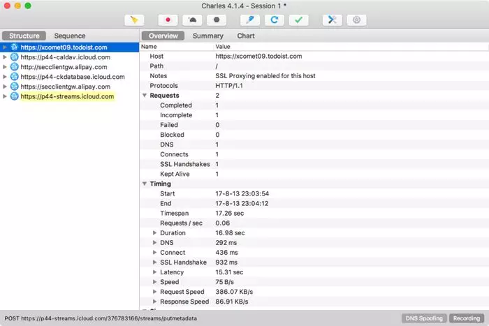 Charles会一直监听PC和手机发生的网络数据包,捕获到的数据包就会显示在左侧,随着时间的推移,捕获的数据包越来越多,左侧列表的内容也会越来越多。