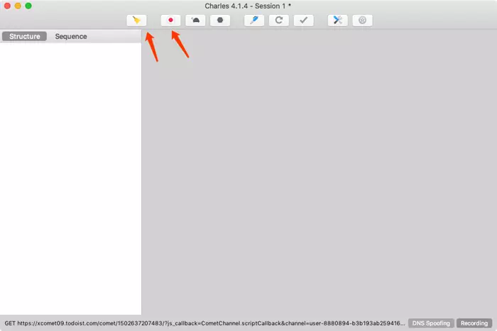 接下来清空Charles的抓取结果,点击左侧的扫帚按钮即可清空当前捕获到的所有请求。然后点击第二个监听按钮,确保监听按钮是打开的,这表示Charles正在监听App的网络数据流,如下图所示。