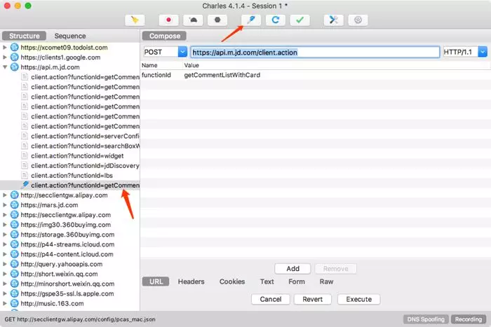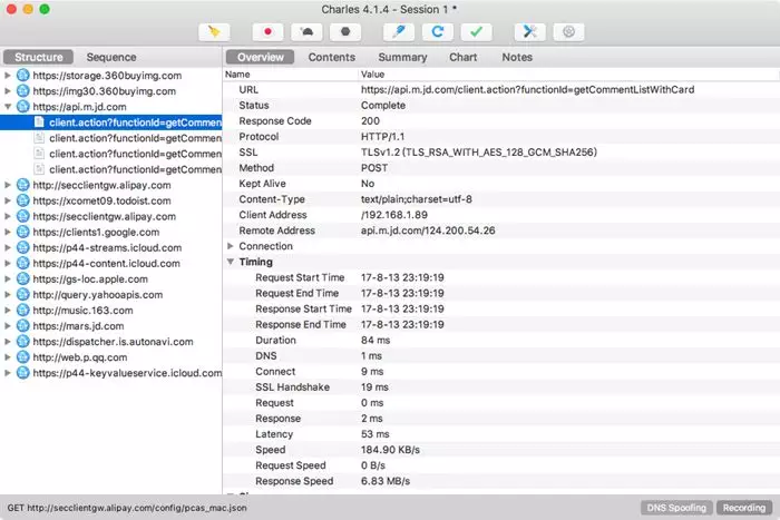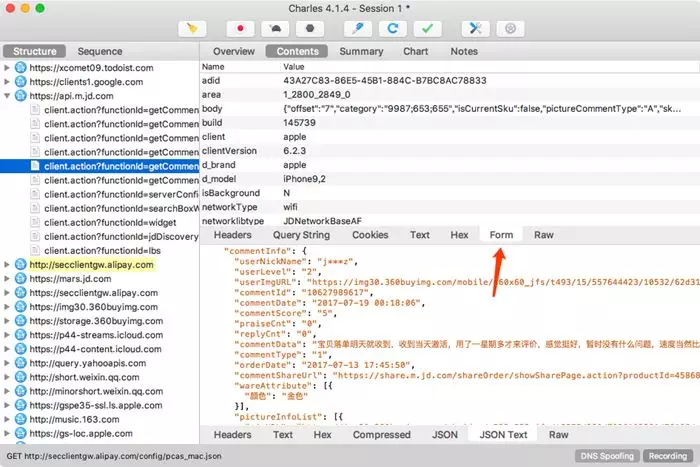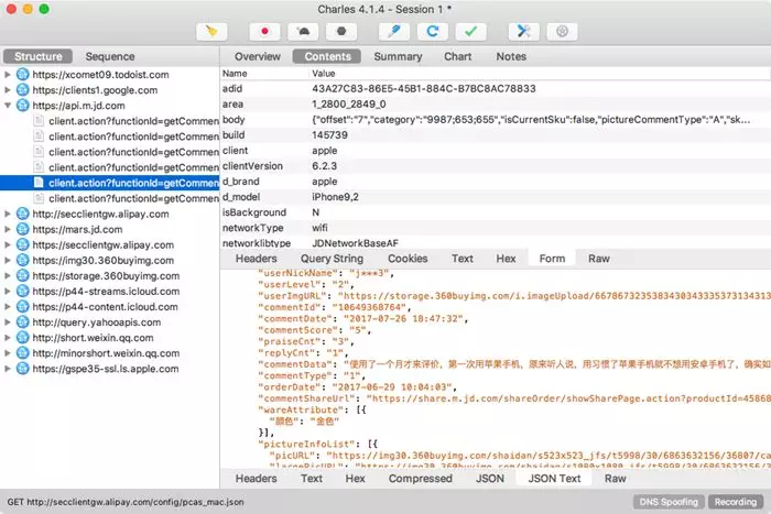 不断上拉加载评论,可以看到Charles捕获到这个过程中京东App内发生的所有网络请求,如下图所示。