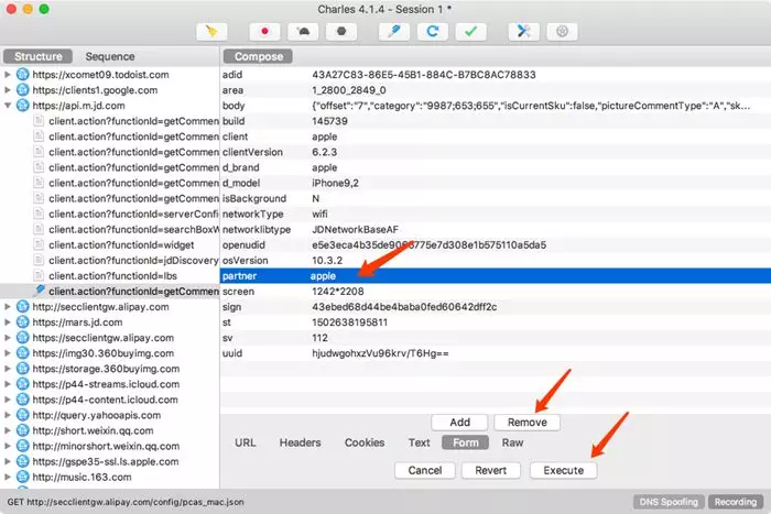 我们可以将Form中的某个字段移除,比如这里将partner字段移除,然后点击Remove。这时我们已经对原来请求携带的Form Data做了修改,然后点击下方的Execute按钮即可执行修改后的请求,如下图所示。