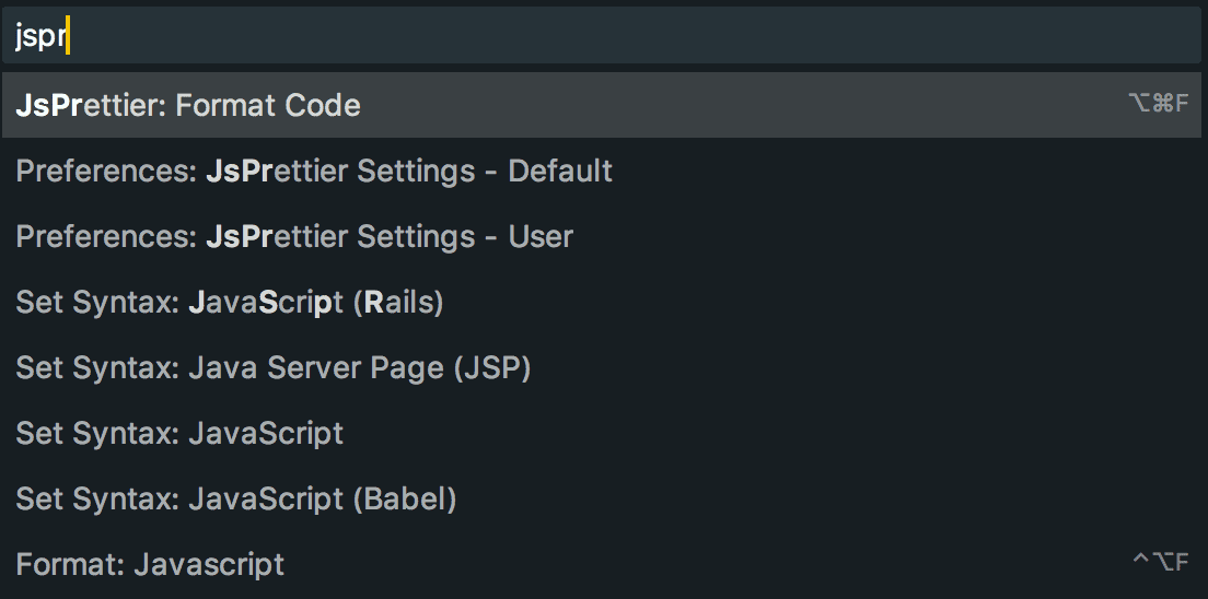 或者设置快捷键 { "keys": ["super+alt+f"], "command": "js_prettier" }。